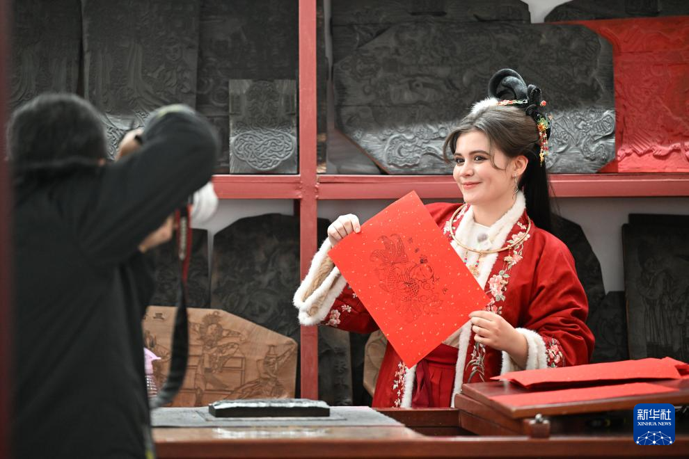 12月3日,游客在天津杨柳青古镇体验年画制作后拍照留影。新华社记者 赵子硕 摄