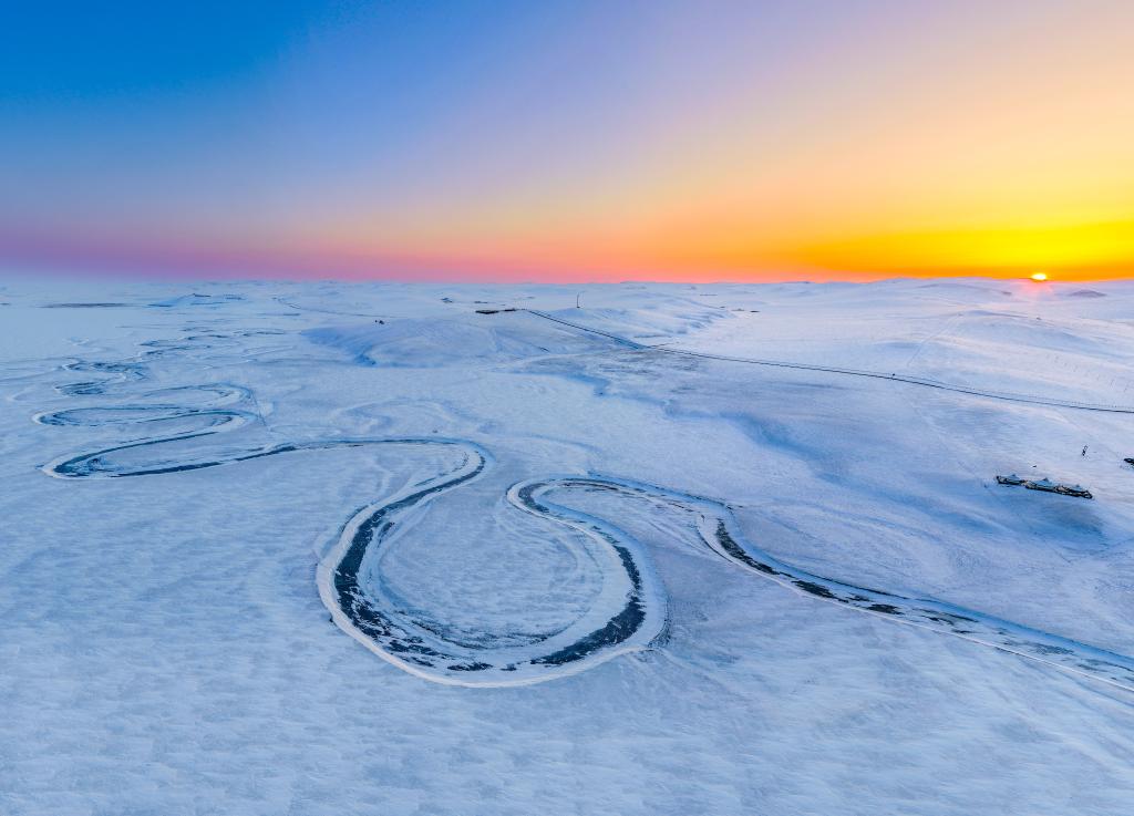 这是12月3日在内蒙古呼伦贝尔市陈巴尔虎旗拍摄的呼伦贝尔大草原日出风光(无人机照片)。新华社记者 马金瑞 摄