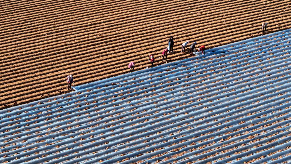 12月6日,在山东省临沂市平邑县临涧镇,农民为蔬菜幼苗覆盖保温薄膜(无人机照片)。新华社发(武纪全摄)