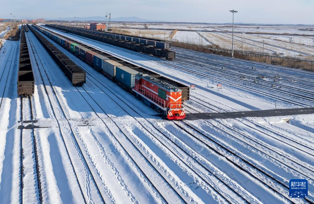 12月10日,中欧班列在中国铁路哈尔滨局集团有限公司满洲里站整装待发(无人机照片)。新华社发(黄旭摄)