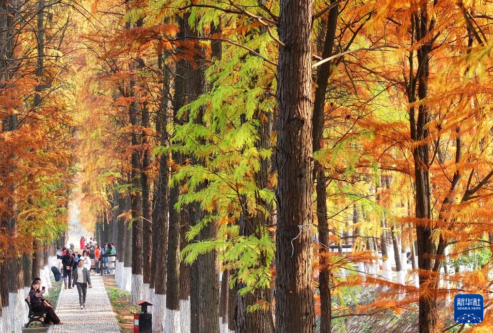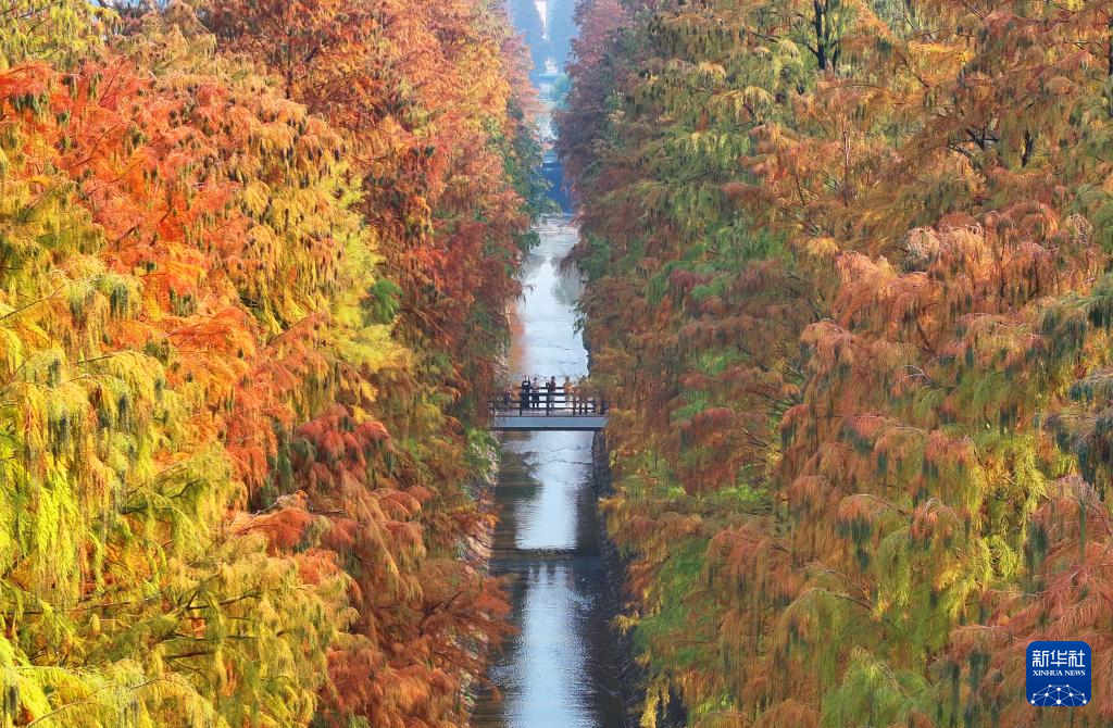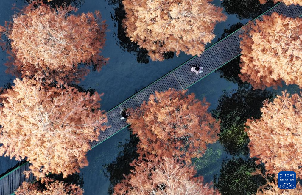 12月10日,游客在湖南省衡阳市雁峰区岳屏镇隆桥村的水杉林休闲游玩(无人机照片)。新华社发(曹正平摄)