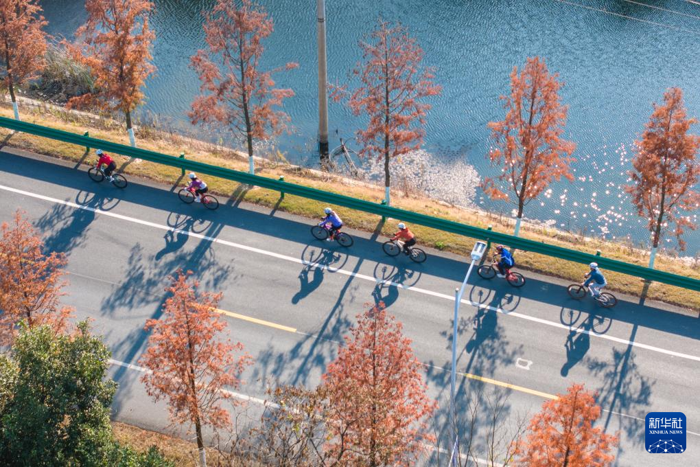 12月7日,在安徽省芜湖市繁昌区繁阳镇范马村,自行车运动爱好者在风景如画的淮九公路上骑行(无人机照片)。新华社发(肖本祥摄)