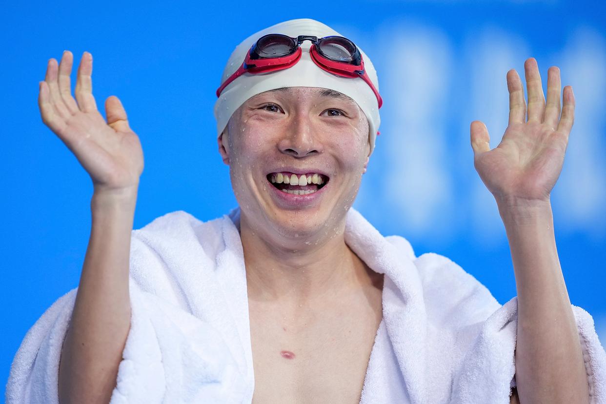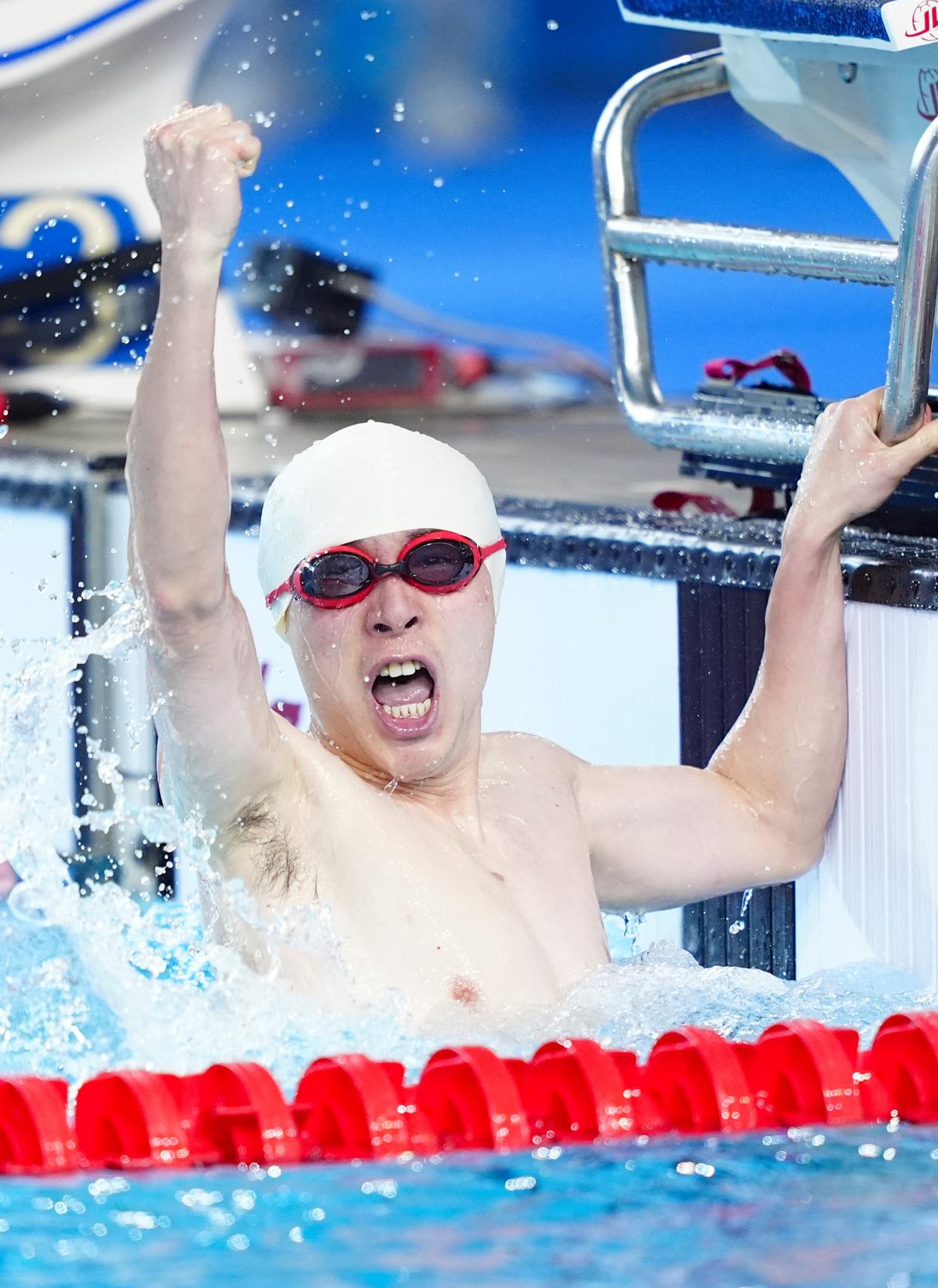 12月14日,孙宇亮在男子22-29岁组100米自由泳决赛第1组结束后庆祝夺冠。新华社记者 齐芷玥 摄