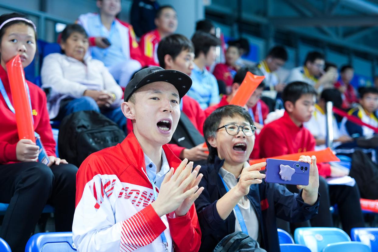 12月13日,孙宇亮(前左)和母亲在观众席为选手加油。新华社记者 伍志尊 摄