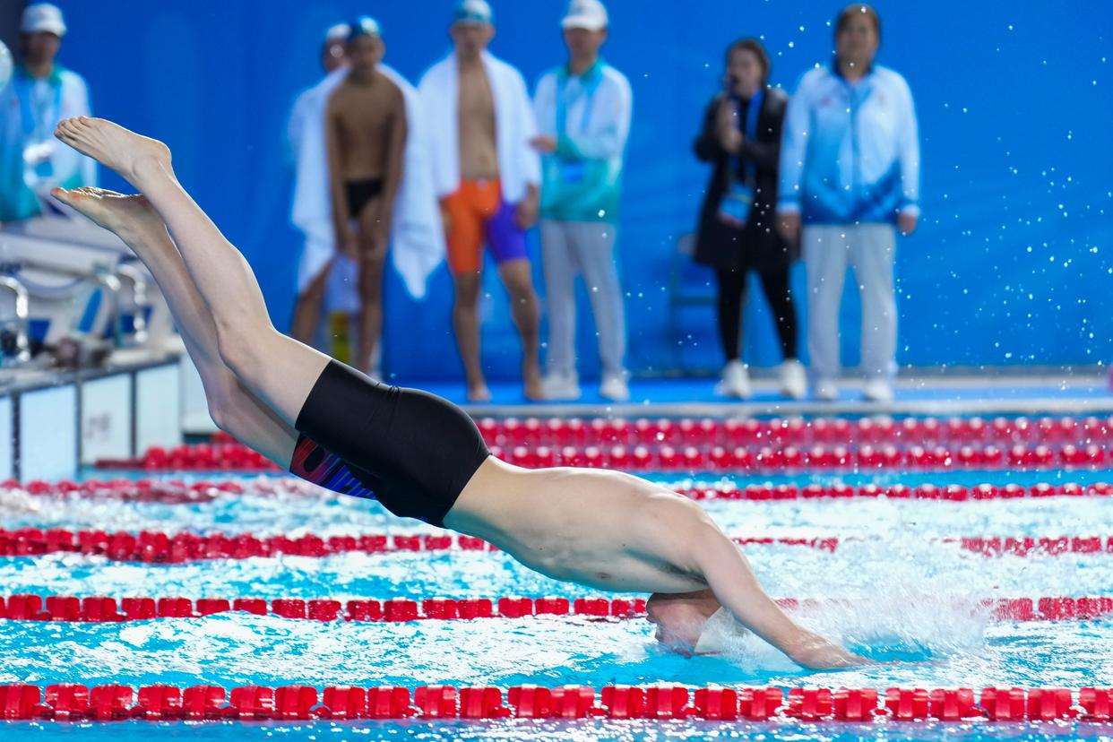 12月14日,内蒙古队第四棒选手孙宇亮在男子22-29岁组4X50米混合泳接力决赛中。比赛中孙宇亮面对落后局面奋起直追实现反超,最终内蒙古队夺得冠军。新华社记者 伍志尊 摄
