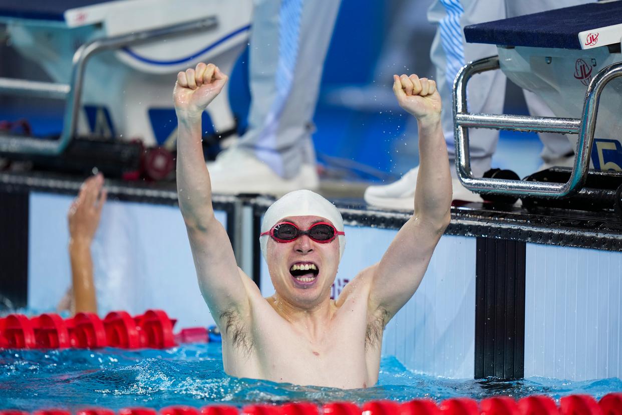 12月14日,内蒙古队第四棒选手孙宇亮在男子22-29岁组4X50米混合泳接力决赛后庆祝。比赛中孙宇亮面对落后局面奋起直追实现反超,最终内蒙古队夺得冠军。新华社记者 伍志尊 摄