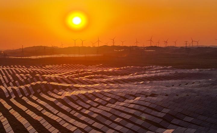 这是2025年9月2日拍摄的库布其沙漠里的内蒙古鄂尔多斯市杭锦旗朔方新能源大基地(无人机照片)。近年来,内蒙古开展防沙治沙与风电光伏一体化工程,推进库布其沙漠治理。“光伏+生态治理”建设模式实现板上发电,板间、板下统筹兼顾特色生态修复、经济作物、造林绿化与技术创新,打造立体生态修复模式,让沙海变成绿色电能涌动的“蓝海”,实现生态效益与经济效益共赢。