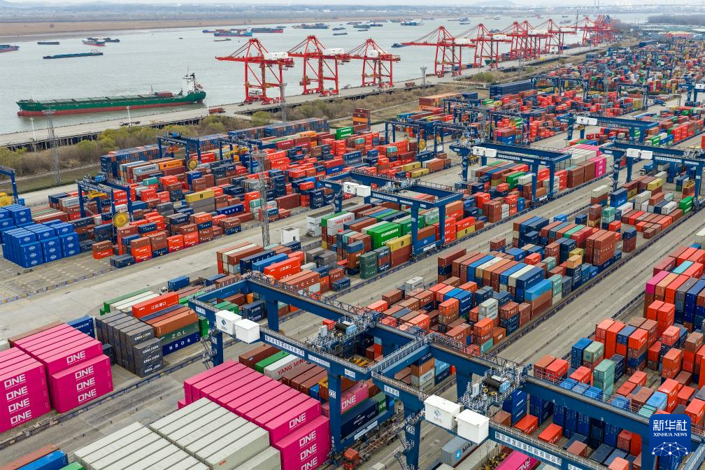 12月31日拍摄的江苏省港口集团南京港龙潭集装箱码头上的生产场景(无人机照片)。新华社发(杨素平摄)