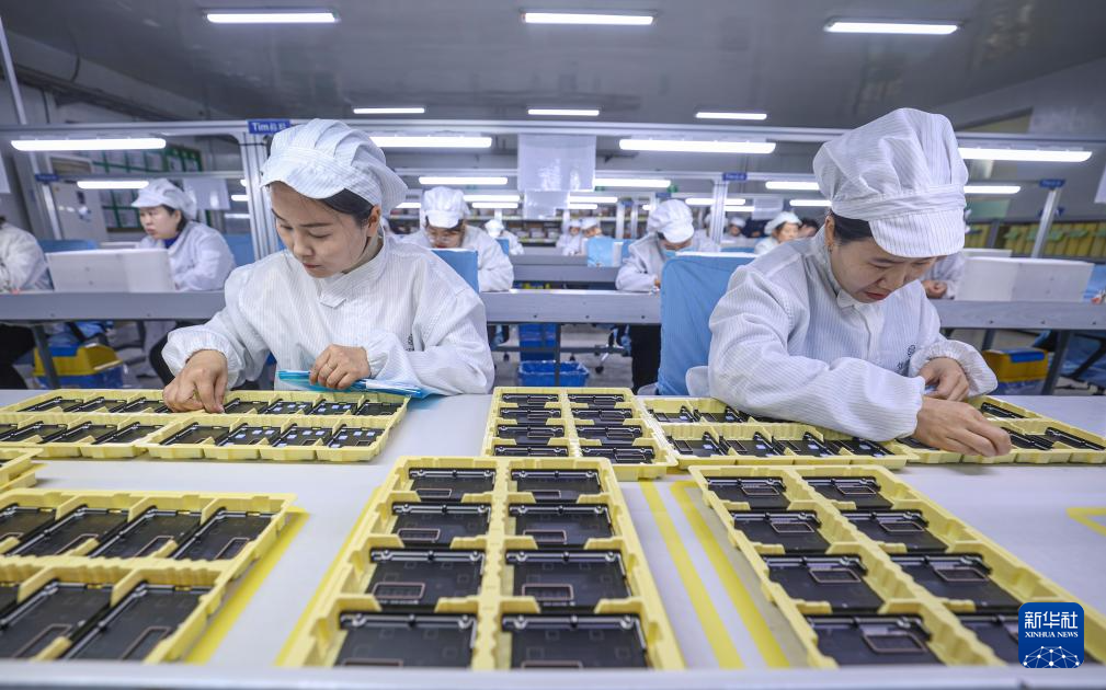 12月31日,在山东省荣成市好运角旅游度假区一家外资电子企业的车间,工人赶制出口国外的电子产品订单。新华社发(李信君摄)