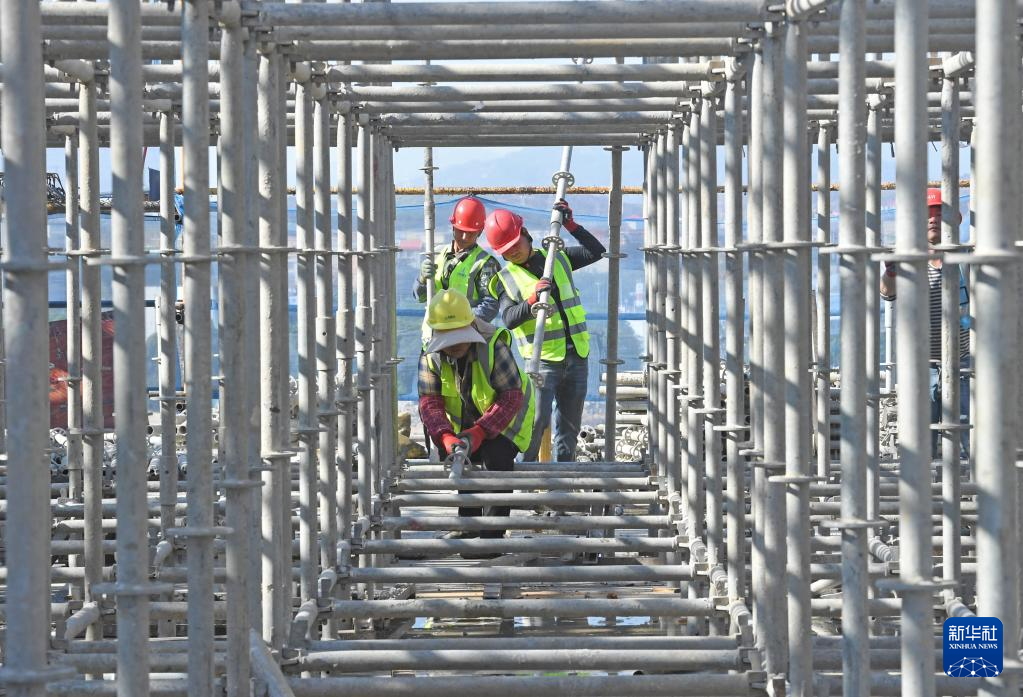 12月30日,在位于泉港石化工业园区的北瑞药业新型医药原料药及针剂项目施工现场,施工人员在搬运脚手架。新华社发(林弘梫摄)