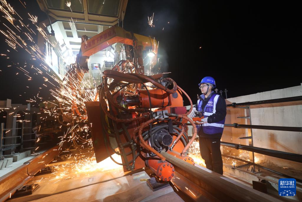12月30日晚,在位于浙江省湖州市德清县的杭德市域铁路施工现场,中铁十一局工人进行钢轨焊接作业。新华社发(谢尚国摄)