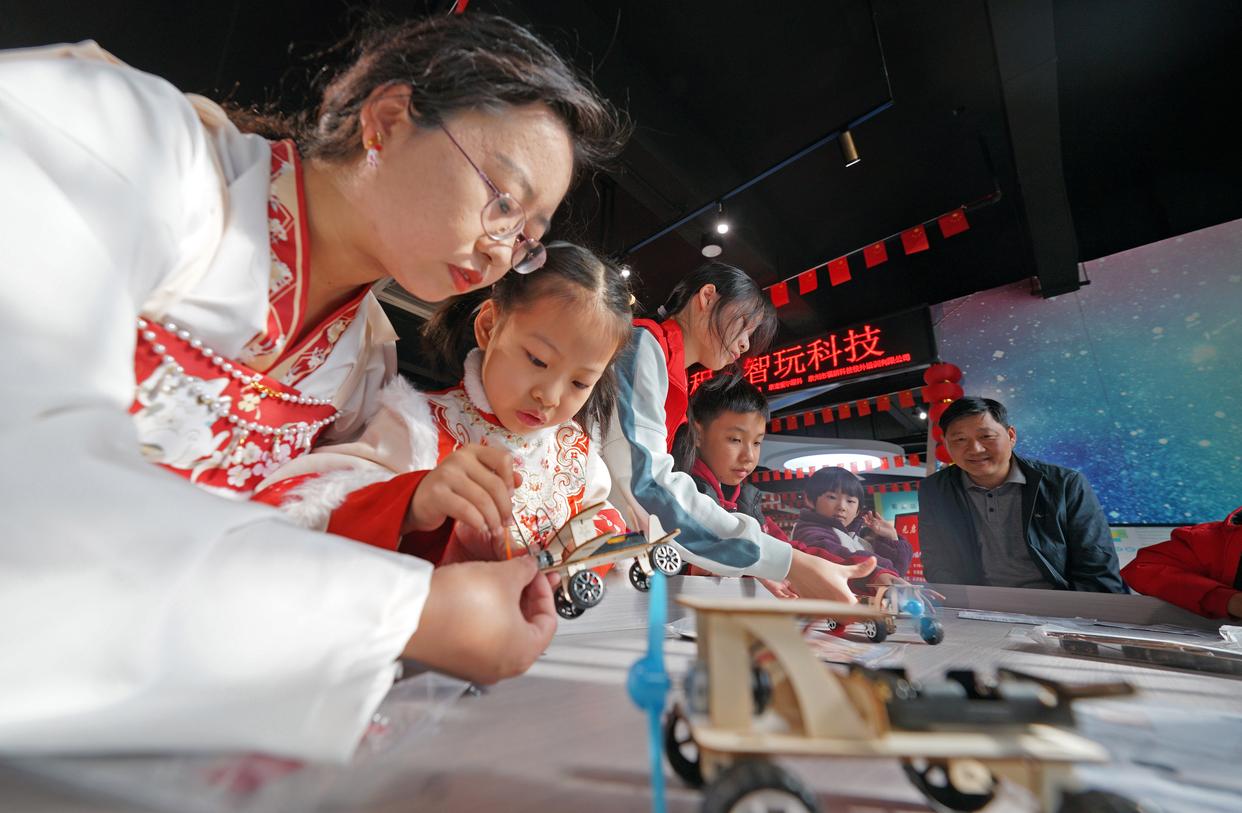 2026年1月1日,在福建省泉州市泉港区科技馆,孩子们在家长的陪伴下参加趣味手工课。 新华社发(林弘梫摄)