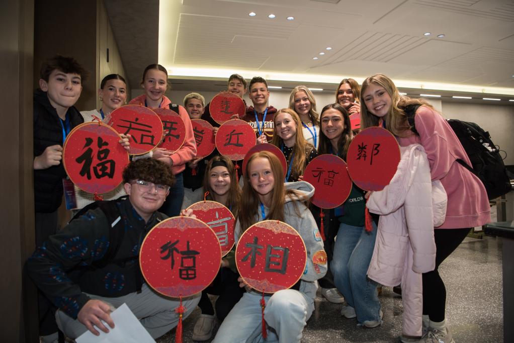 2025年12月31日,美国艾奥瓦州青少年“友谊传承”研学团成员展示书法作品。新华社发(刘尊拴 摄)