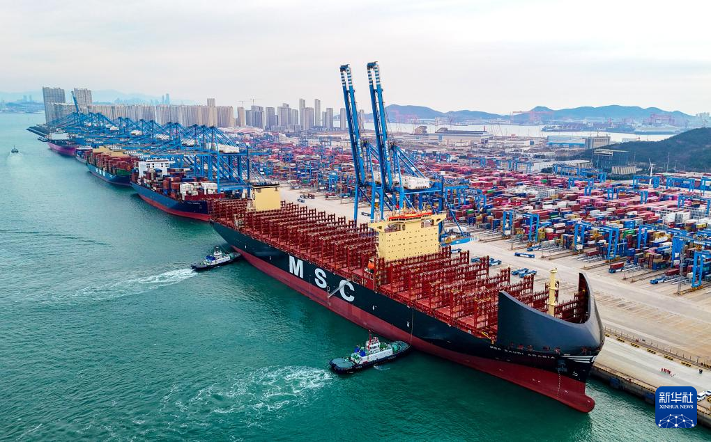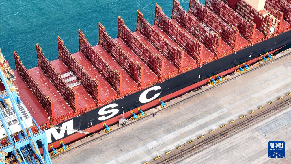 2026年1月1日,在山东港口青岛港,“地中海沙特阿拉伯”轮通过真空式自动系泊系统停靠码头(无人机照片)。新华社发(张进刚 摄)