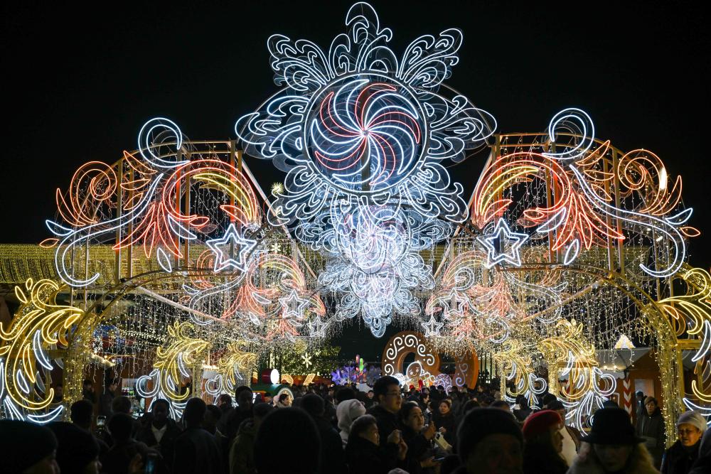 2025年12月31日,人们走过哈萨克斯坦阿拉木图的新年灯饰。