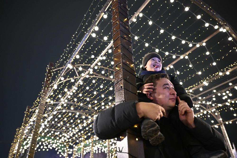 2025年12月31日,一名男子带着孩子在哈萨克斯坦阿拉木图参加新年庆祝活动。