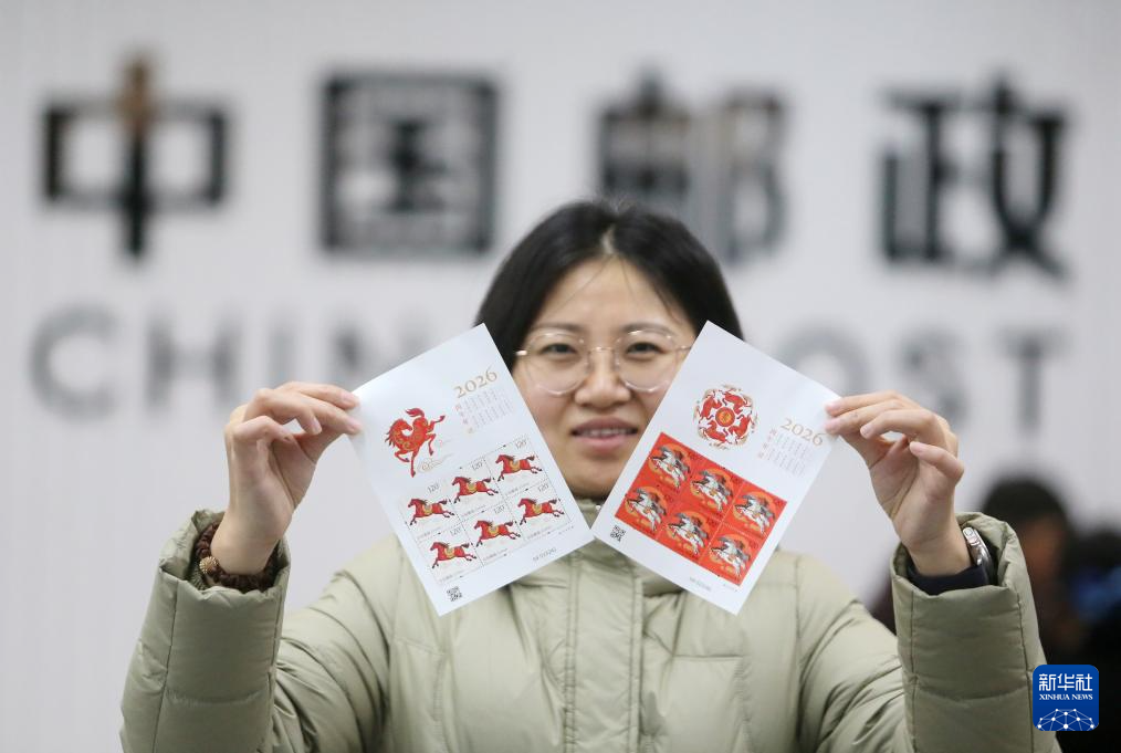 1月5日,在安徽安庆市一邮政网点,工作人员展示《丙午年》特种邮票。新华社发(徐火炬摄)