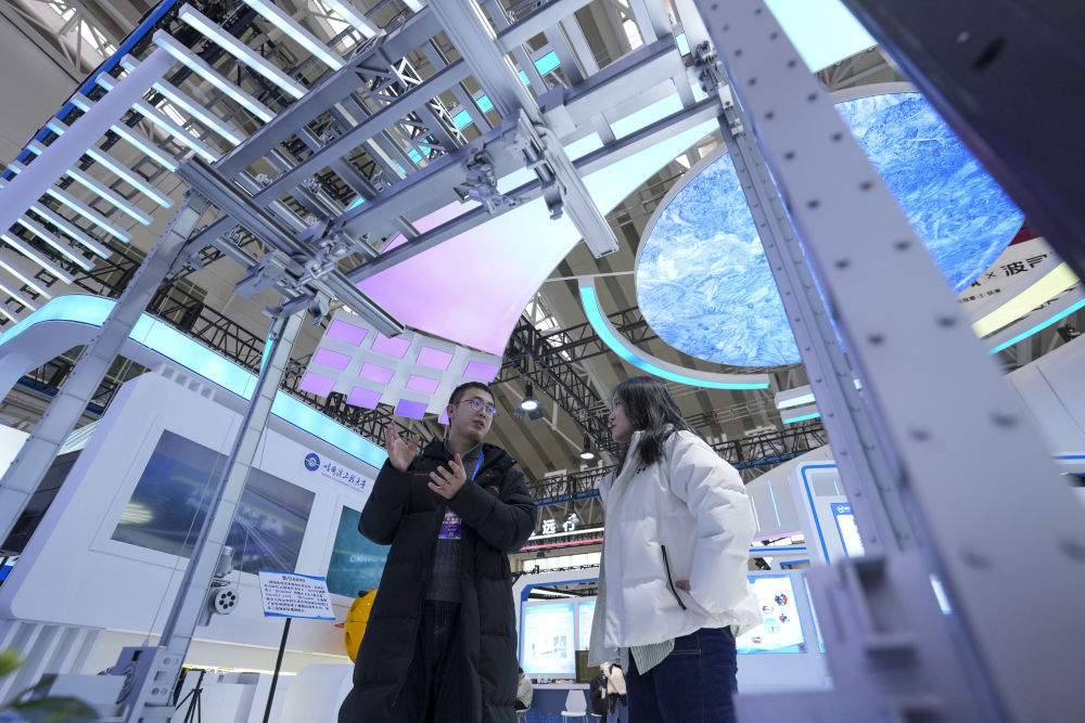 2026年1月6日,在2026哈尔滨国际冰雪经济博览会展会现场,参观者咨询一款碳纤维滑雪板性能。