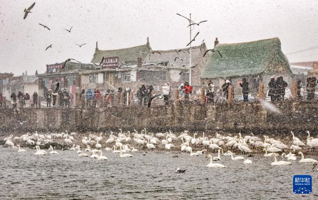 1月10日,在山东省荣成市俚岛镇烟墩角村,游客冒雪观赏大天鹅。新华社发(李信君摄)