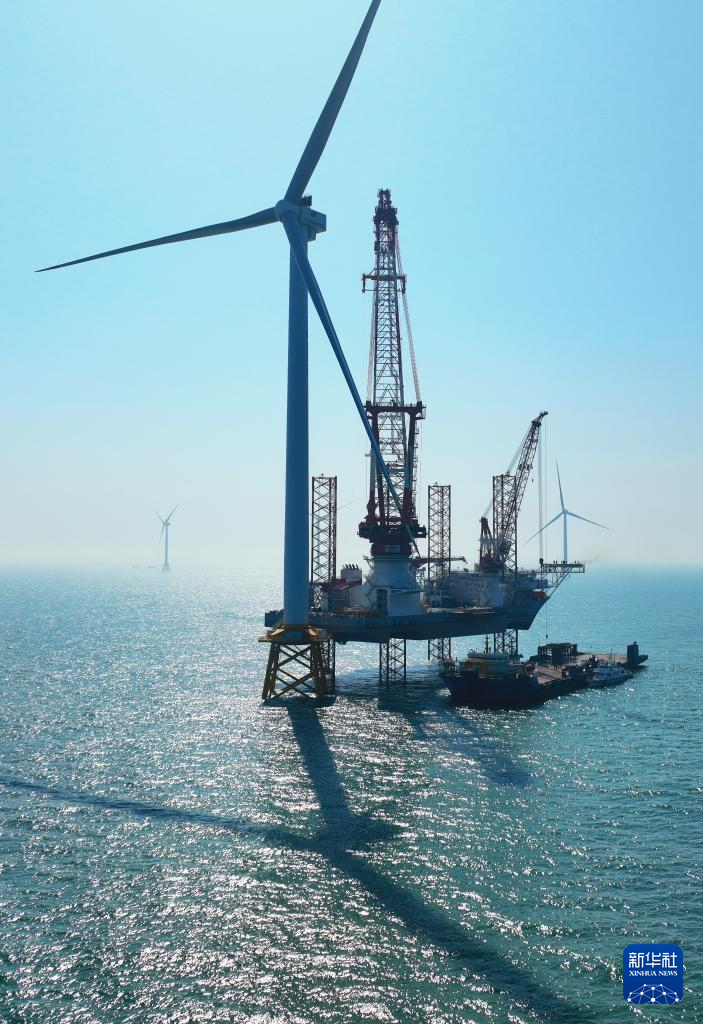 1月13日在闽南海域拍摄的吊装完成的20兆瓦海上风电机组(无人机照片)。