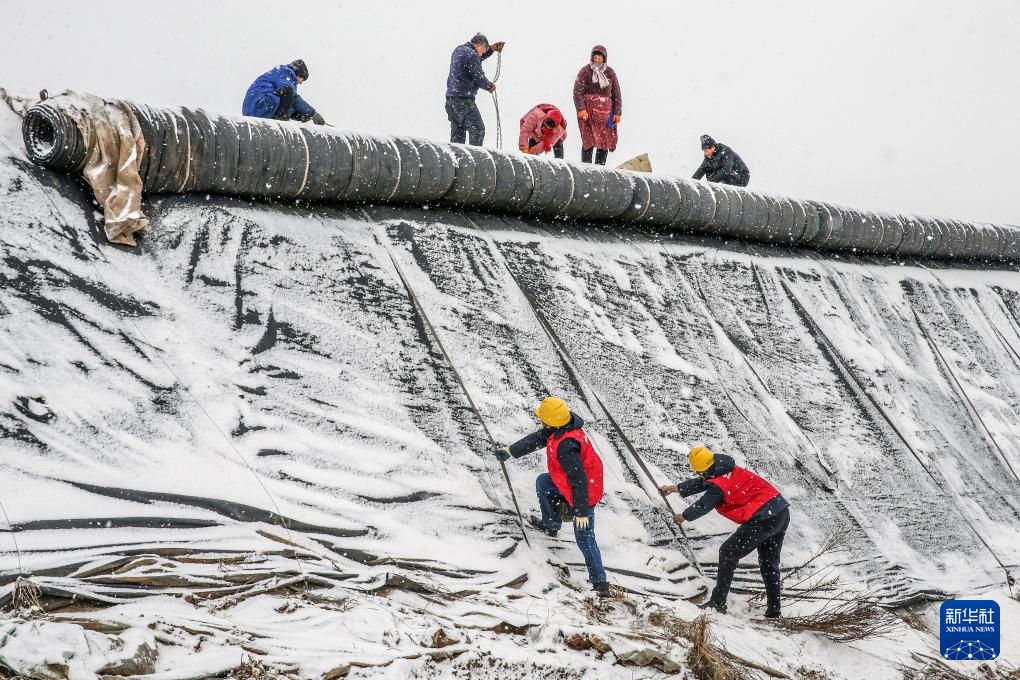 1月19日,在河南省焦作市博爱县孝敬镇博爱源蔬菜专业合作社,辖区供电职工帮助菜农对蔬菜大棚保暖棉被进行维护。新华社发(程全摄)