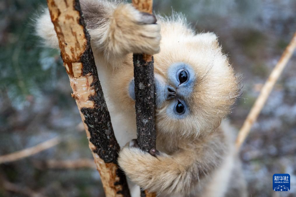 1月19日,一只金丝猴在神农架国家公园大龙潭金丝猴野外研究基地啃食树皮。新华社记者 杜子璇 摄