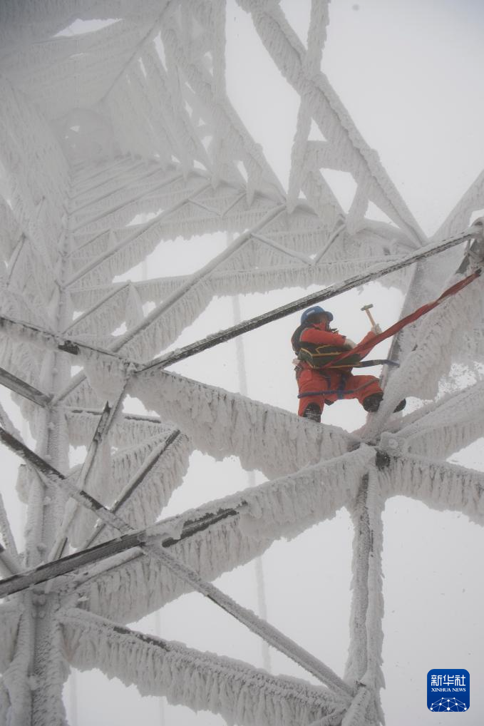 1月21日,在鹤峰县走马镇,抢修人员在35千伏电力线路铁塔进行人工除冰作业。新华社发(杨顺丕摄)