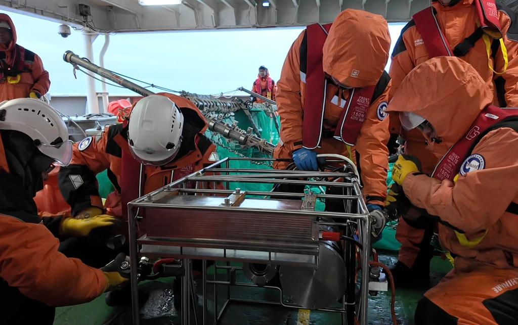 考察期间,大洋队重点开展潜标回收和布放作业、采集海水与沉积物等样品、获取海洋环境背景参数,持续监测极地海洋生态环境参数的年际变化。