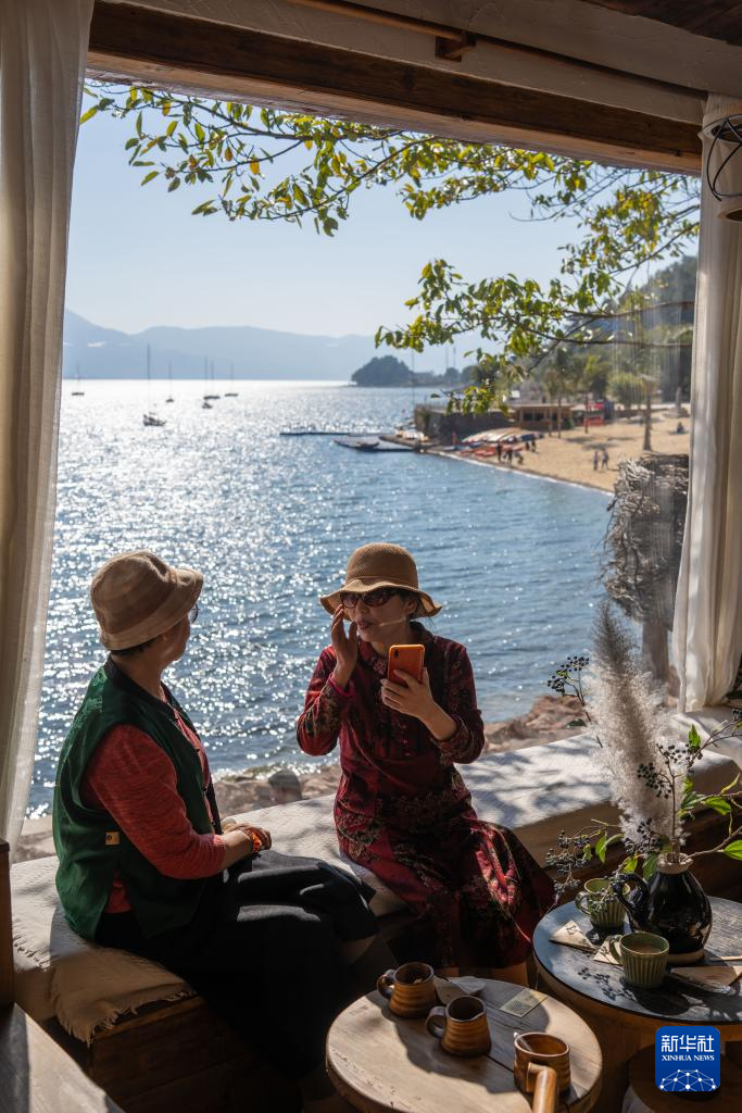 1月27日,游客在云南省玉溪市抚仙湖畔一家咖啡厅休闲。新华社记者 高咏薇 摄