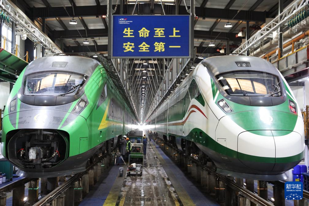 1月28日凌晨,工作人员在南京南动车运用所检修动车组列车。新华社发(杨素平 摄)
