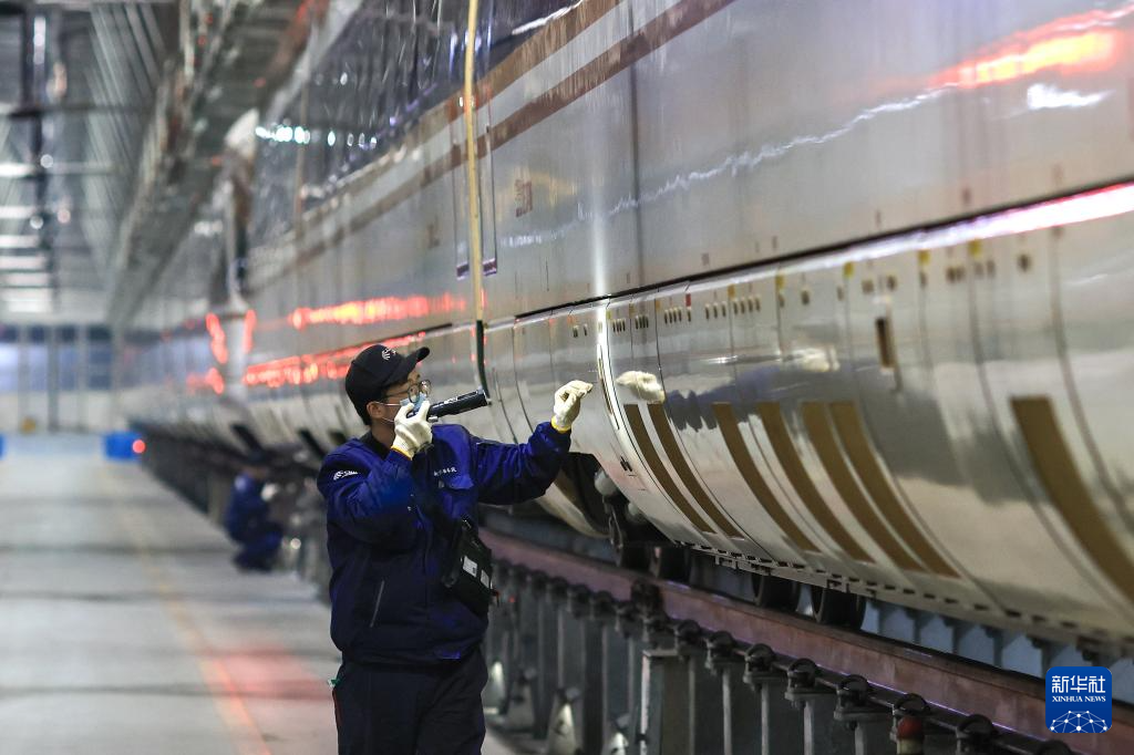 1月27日晚,工作人员在南京南动车运用所检修动车组列车。新华社发(杨素平 摄)