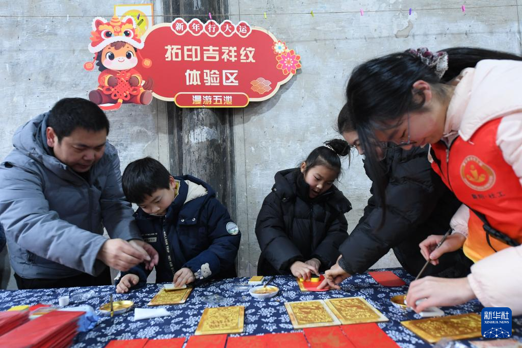 1月31日,在五泄镇十四都村古民居,孩子们在老师的带领下体验吉祥纹拓印。新华社记者 翁忻旸 摄