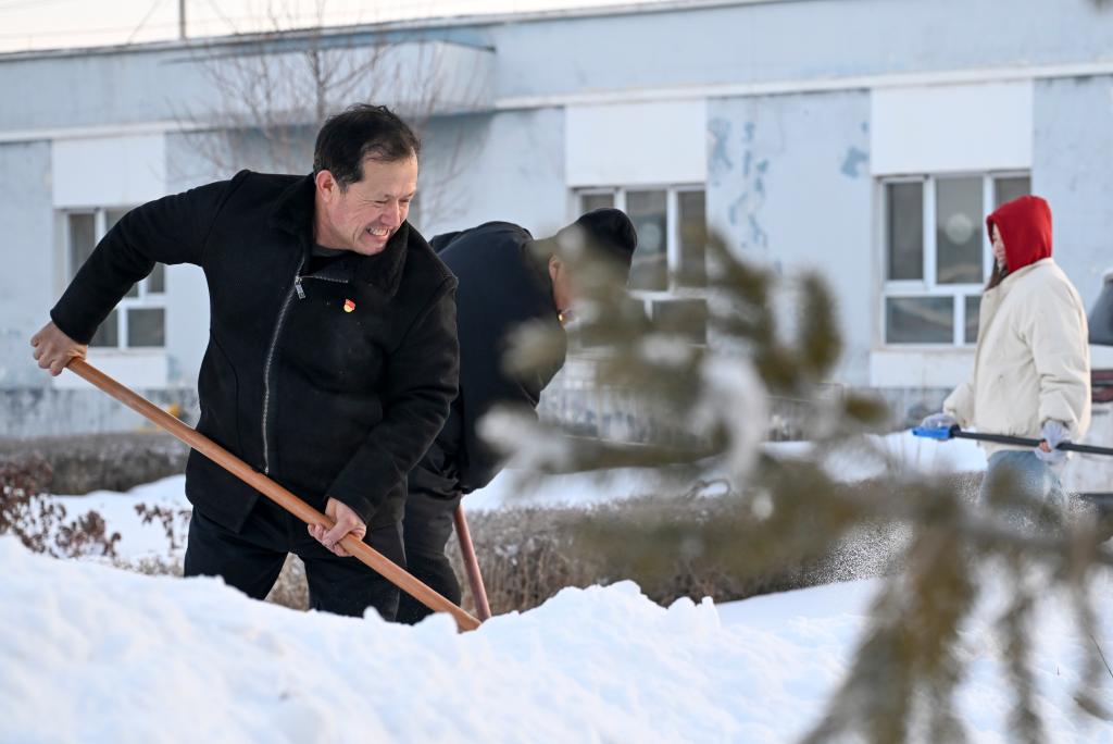 2月9日,在新疆伊犁哈萨克自治州新源县,全国人大代表木沙江·海拉特(前)在克热格塔斯村党群服务中心和当地干部一起清理积雪。新华社记者 王菲 摄