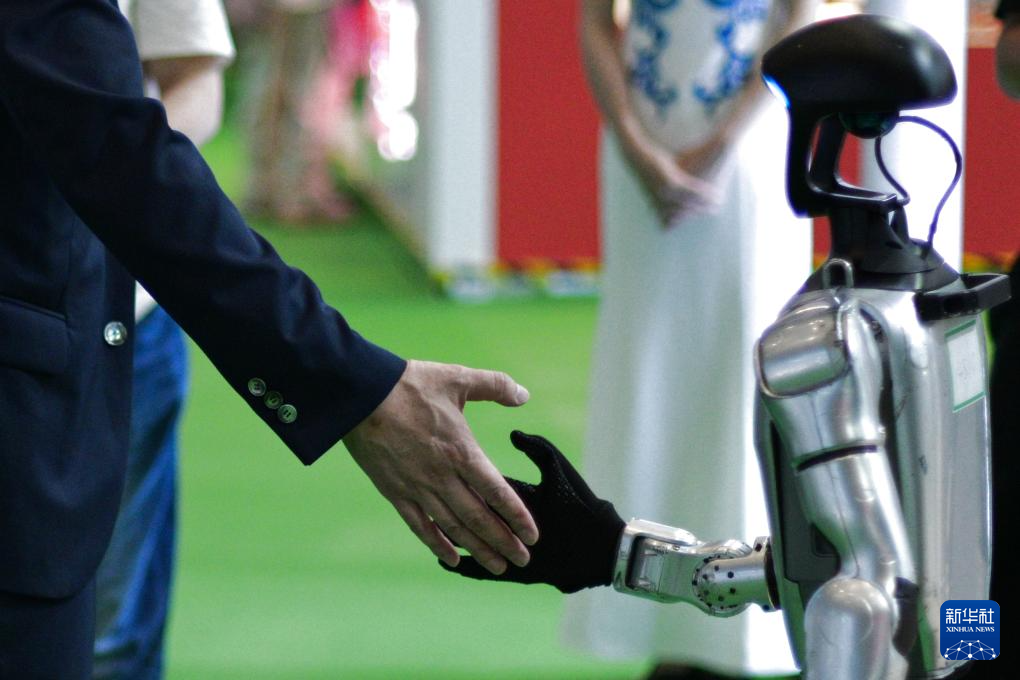 4月13日,一名男子在第六届消博会上与一款人形机器人握手。新华社记者 辛悦卫 摄