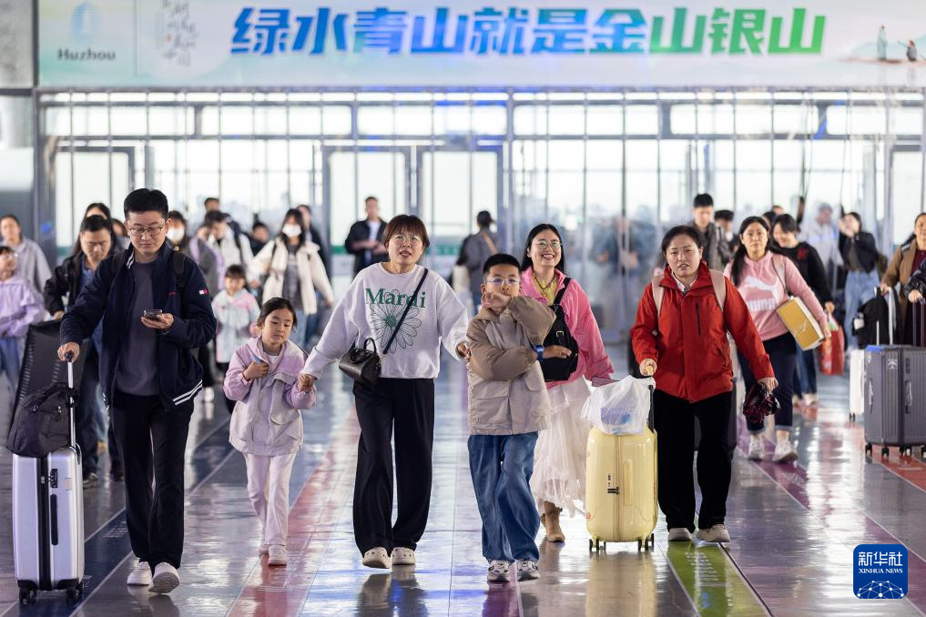 4月29日,在浙江湖州站候车大厅,旅客检票进站。新华社发(伊凡摄)