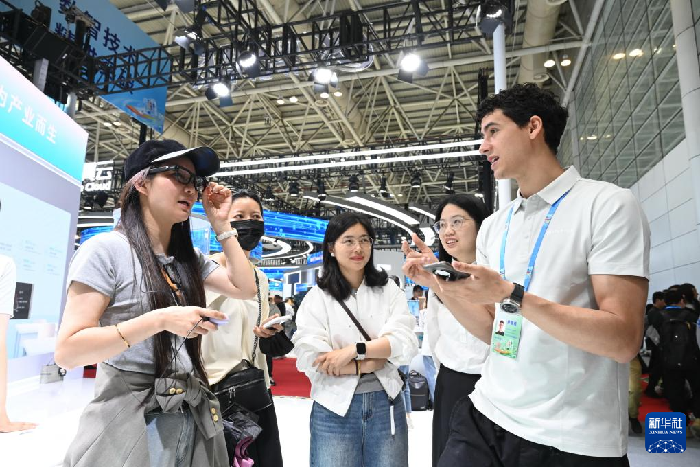 4月29日,观众(左一)在第九届数字中国建设峰会现场体验区体验AI翻译眼镜。新华社记者 林善传 摄