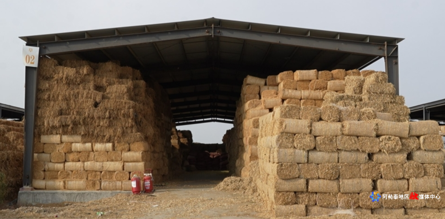 在阿勒泰市切尔克齐乡黑走马农牧业养殖专业合作社,一捆捆牧草在阳光下泛着金灿灿的光泽,青贮窖里装满新鲜的青贮饲料,淡淡的青草香扑面而来。