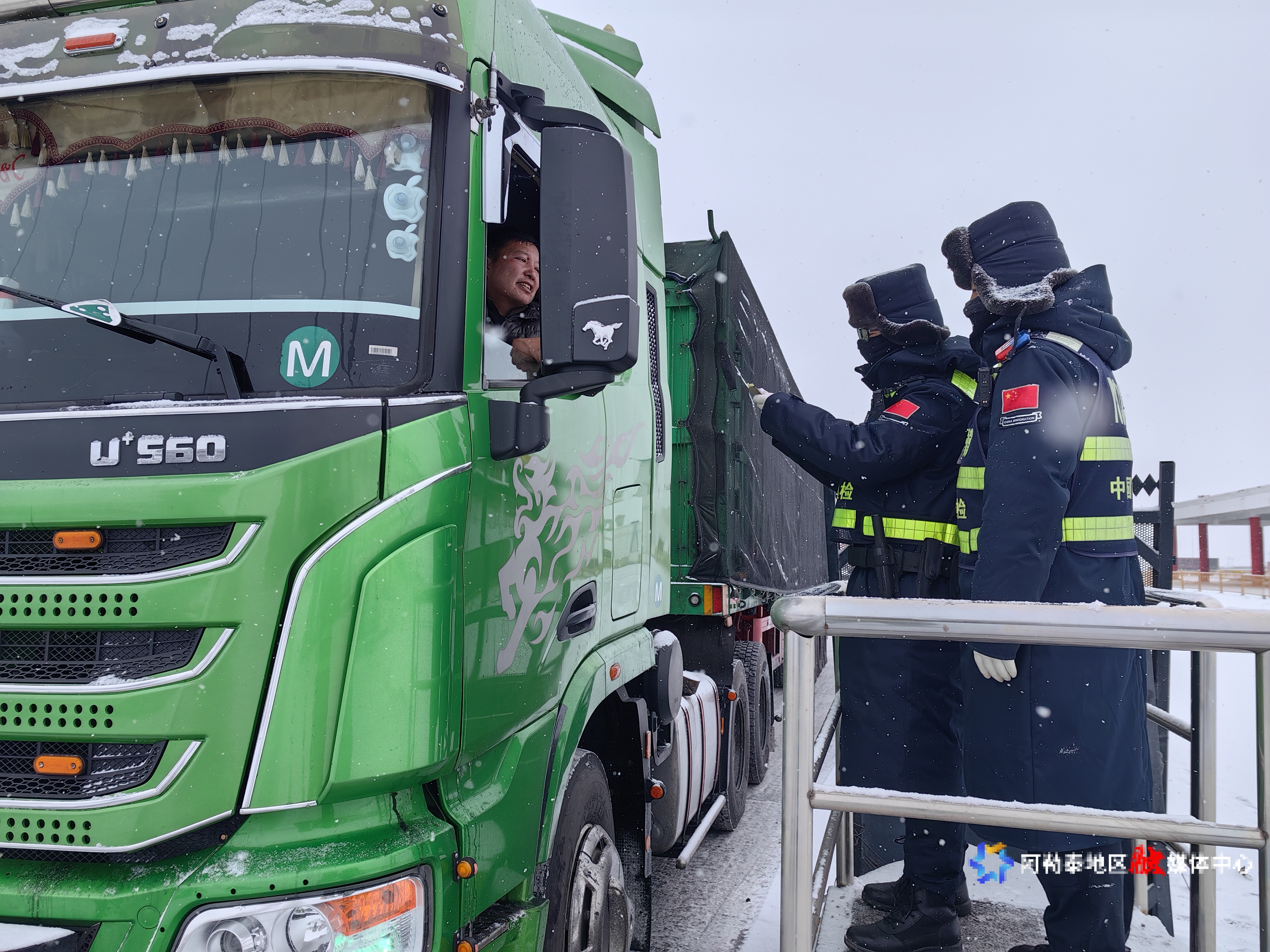 阿勒泰新闻网-阿勒泰地区融媒体中心(记者 朱马别克·卡德尔别克 通讯员 陈明俊 摄)11月22日,塔克什肯口岸迎来风雪天气,塔克什肯出入境边防检查站执勤民警始终坚守一线,全力确保能源运输通道安全畅通。