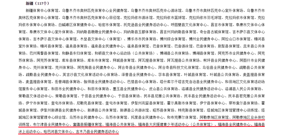 根据名单,阿勒泰地区共有10个体育场馆入选,分别为阿勒泰地区体育馆、阿勒泰地区业余体校训练馆、布尔津县全民健身中心、富蕴县援疆体育馆、福海县公共体育场、福海县大庆援建青少年活动中心(公共体育馆)、福海县全民健身中心、福海县冰上运动中心、哈巴河县文体中心、吉木乃县全民健身活动中心。