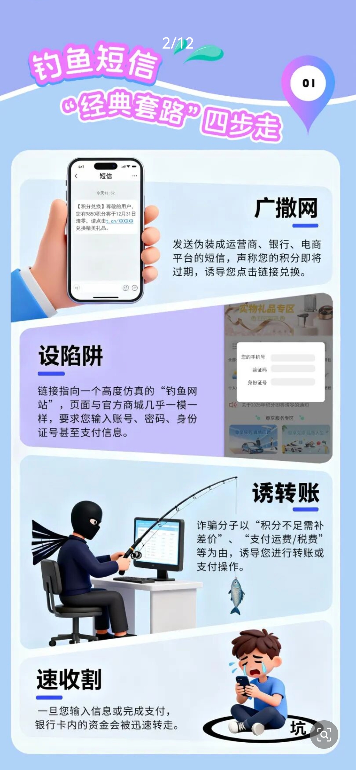 据该公司工作人员介绍,“积分清零”骗局主要分为两类。第一类是钓鱼短信诈骗:诈骗分子伪装成运营商、银行或电商平台等,发送“积分即将过期”“尽快兑现”等短信,附带的“兑换链接”实为高度仿真的钓鱼网站,会诱导用户输入账号、密码等支付信息,后续诈骗分子会以“补差价”“付运费/税费”等名义,催促用户转账或支付,一旦用户操作,银行卡内资金便会被迅速转走。第二类是冒充客服来电诈骗。骗子自称某平台客服,能准确报出用户姓名、会员等级等信息,以“积分即将清零”制造紧迫感,以“协助兑换”为名引导用户通过电话操作,逐步套取短信验证码并登录用户账号,进而盗刷积分或诱导转账。
