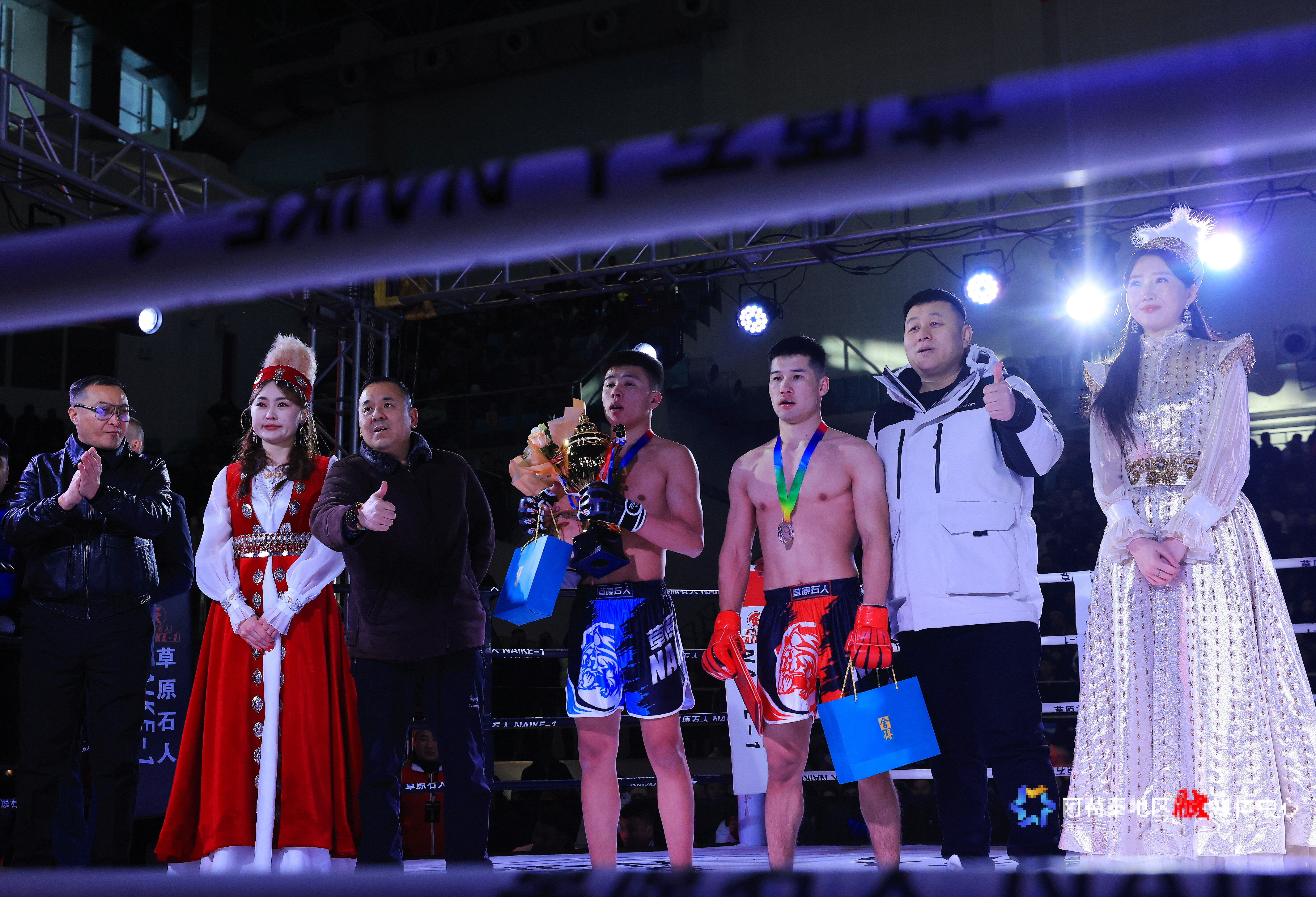 首届“草原石人杯”NAIKE—1 MMA国际综合格斗挑战赛(阿勒泰站)颁奖仪式。记者 阿尔达克·拜斯汗摄