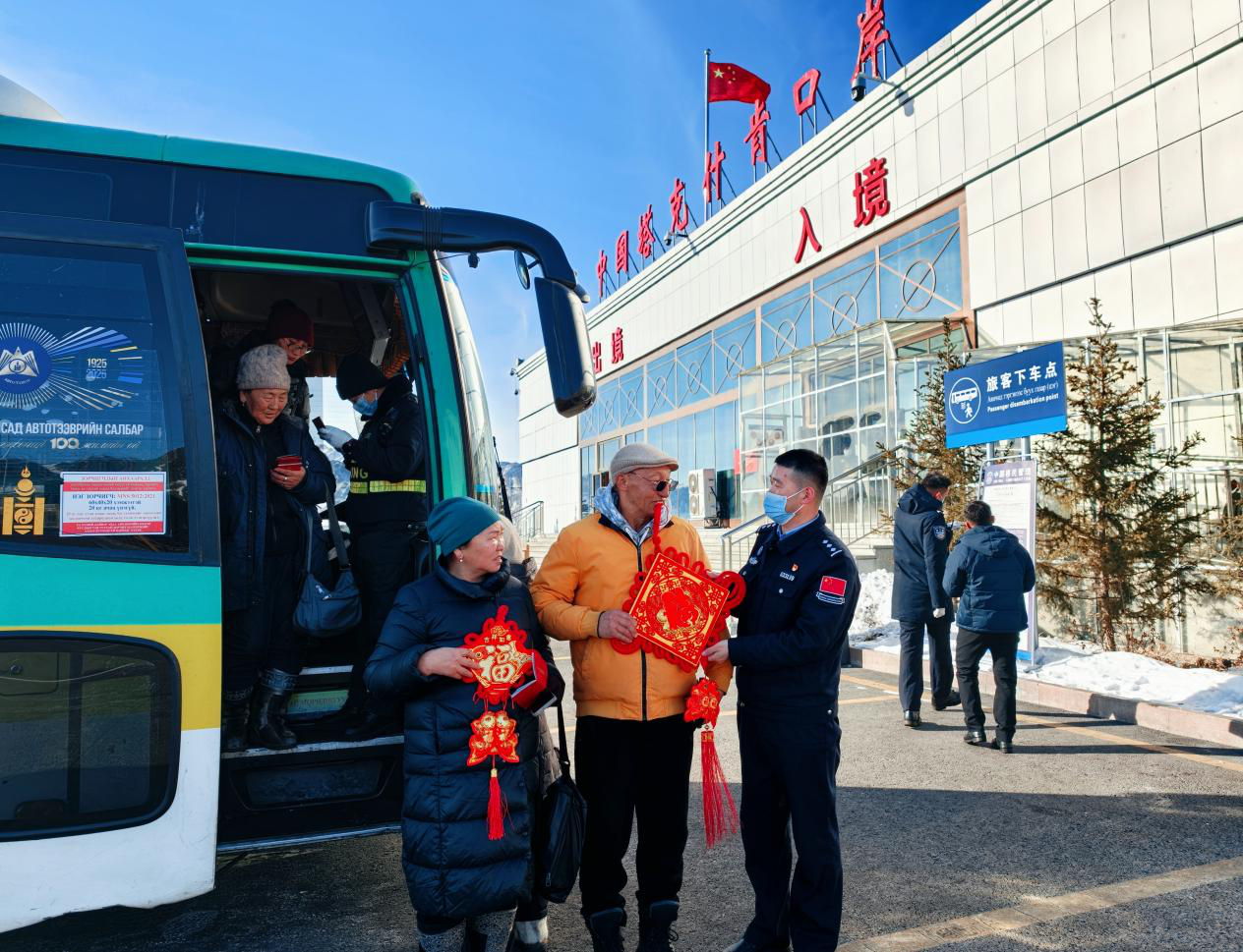 车体检查区域,民警在高效完成车辆查验的同时,化身“文化使者”,将一副副寓意吉祥的春联、一个个精致喜庆的中国结送到蒙古国司机朋友们手中,让国际友人感受中华优秀传统文化的魅力。