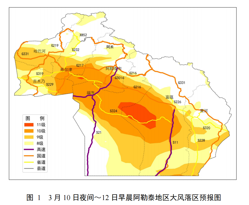 大风预报:3月10日夜间~12日早晨(3月11日02时~12 日08时),我区大部有8级偏西大风,将普遍出现风吹雪; 吉木乃县、福海县及富蕴县大部,哈巴河县县城、龙源风电场、齐巴尔镇、齐德哈仁、额河沿线,布尔津县冲乎尔镇以南区 域,阿勒泰市阿拉哈克镇、切尔克齐乡、巴里巴盖乡风力达9~10级,将出现强风吹雪; 吉木乃县科克布喀、色热铁尔、木乎尔台片区,布尔津江阿 吾孜、科克逊山、奥马尔套,福海县乌伦古湖湖区、阿克达拉片 区、黄沃尔海片区,阿勒泰市萨尔胡松乡、中广核风电场,富蕴 县杜热镇、喀拉布勒根乡风力可达11级,将出现特强风吹雪(图 1)。