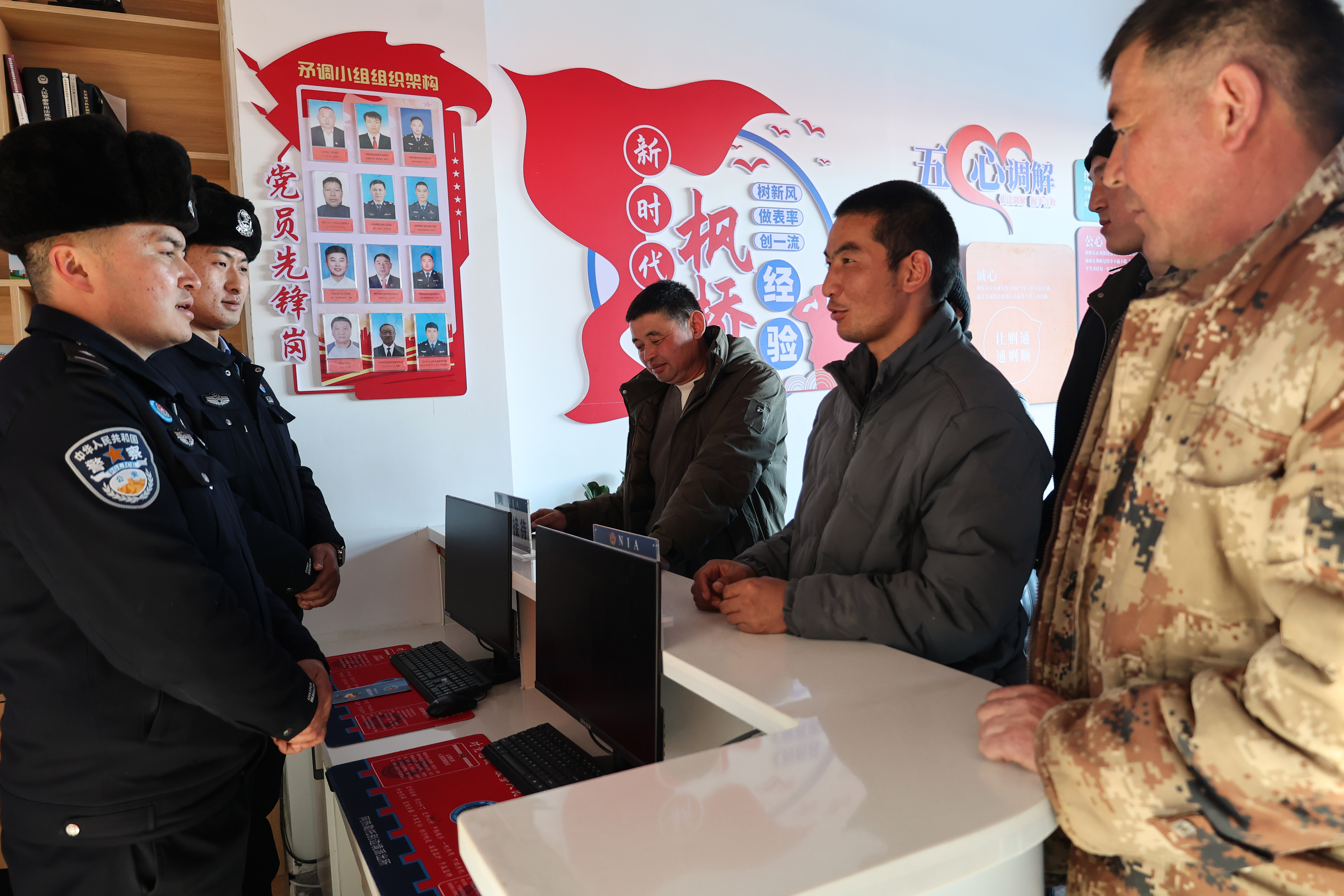3月7日,新疆阿勒泰边境管理支队阿热勒托别边境派出所“重卡警务驿站”为卡车司机提供服务。通讯员 李晋摄
