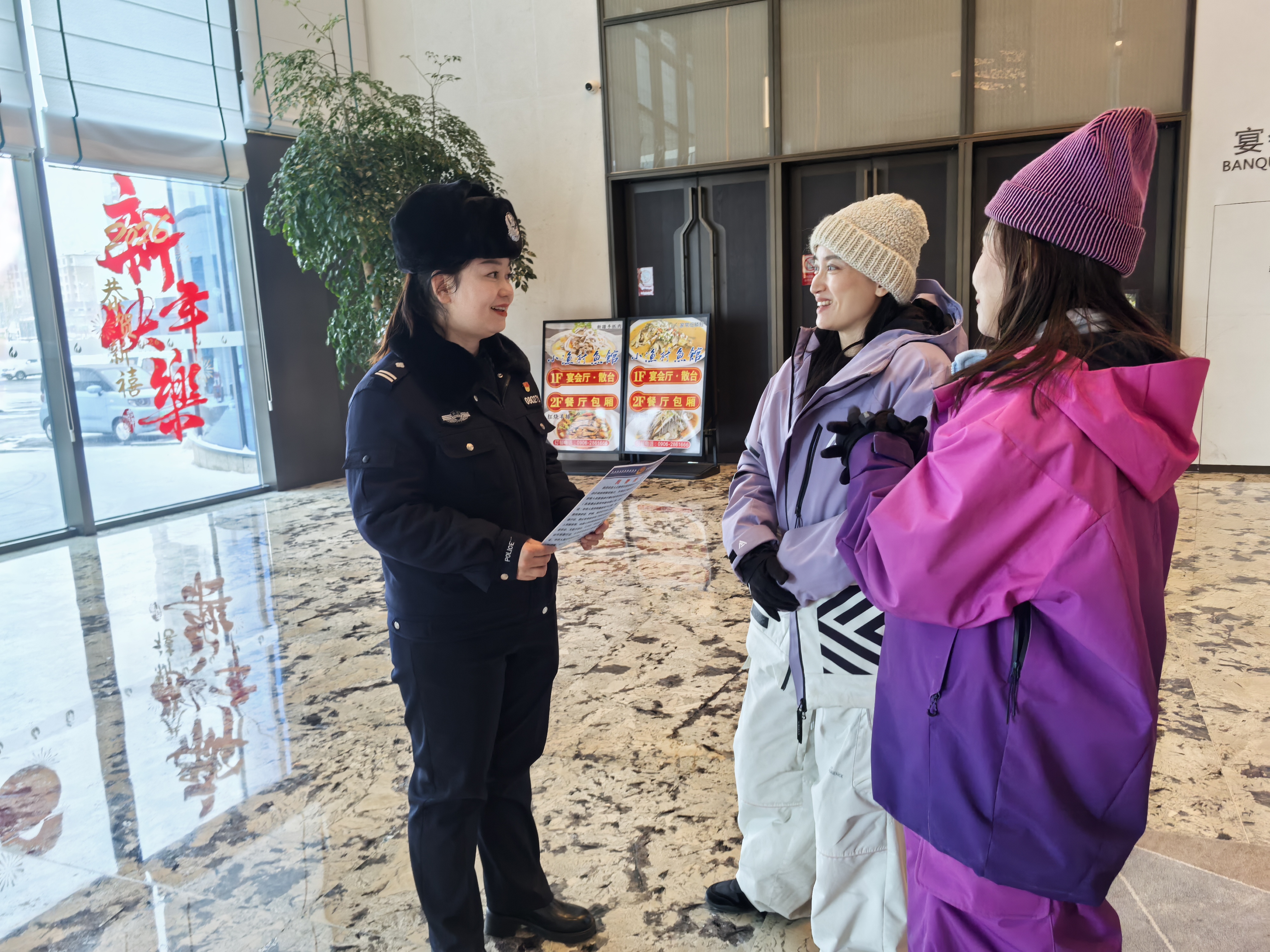 2月9日,阿勒泰市公安局民警深入辖区酒店向游客宣传防范电信网络诈骗普及教育提升游客防骗意识。通讯员 周涛摄