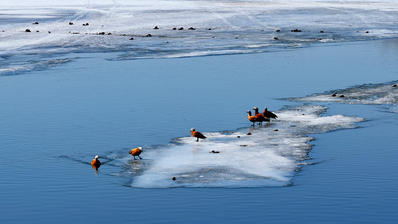 此次现身的赤麻鸭,是阿勒泰地区的常见鸟种,也是候鸟迁徙中最晚离开的鸟类之一。其全身栗黄色的羽色辨识度极高,颈部狭窄的黑色颈环与翼上醒目的白色斑形成鲜明对比,铜绿色的翼镜在阳光下熠熠生辉。它们偏好平原湖泊、河流及沼泽等淡水水域,常以数十只至数百只的群体活动,在浅滩和陆地间觅食,是湿地生态系统健康与否的重要“指示物种”。