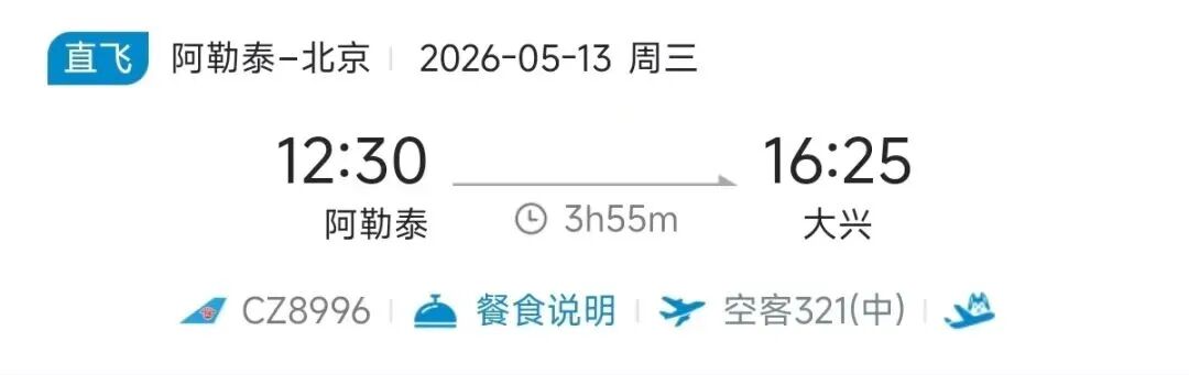 去程航班10:50从阿勒泰起飞