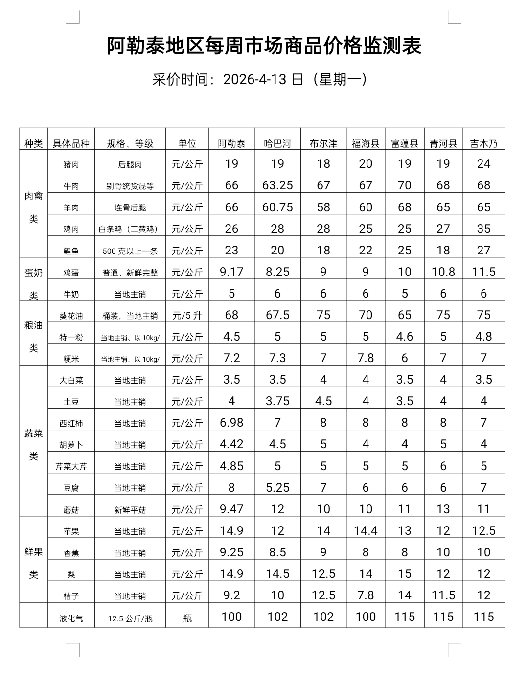 阿勒泰地区每周市场商品价格监测表