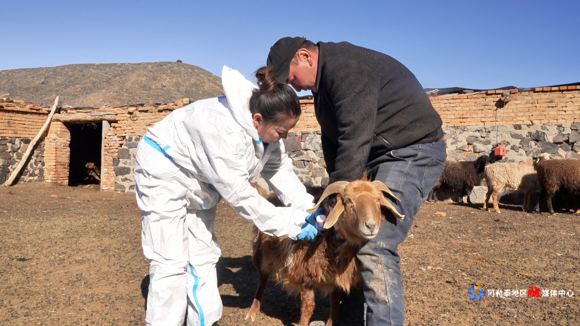 吉木乃县乌拉斯特镇齐阔尔加村,村级防疫员叶丽努尔·巴合道吾列提为村里最后两户牧民的上百只牛羊逐一接种口蹄疫疫苗。
