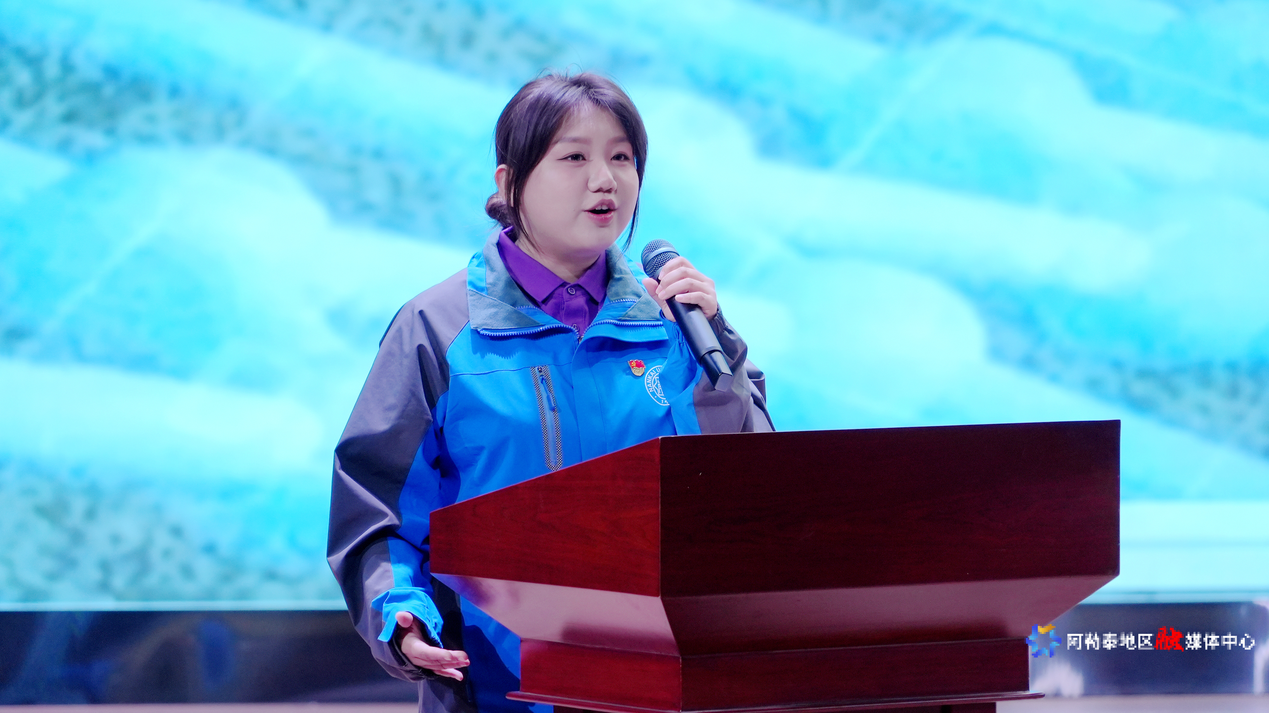 铸牢中华民族共同体意识、建设社会主义现代化新疆“雪都石榴红”宣讲团赴基层巡回宣讲活动现场,阿勒泰地区融媒体中心记者古扎丽·阿布都热西提正在宣讲。